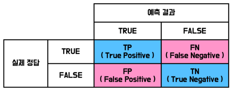 3. Recall(재현율) = TP / (TP + FN) = 실제 True값을 얼마나 많이 예측했는지 = Positive 데이터가 더 중요한 경우