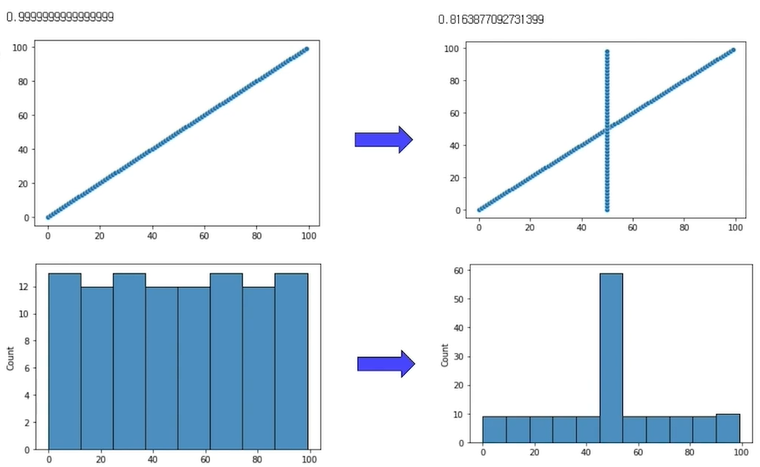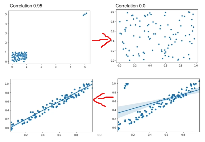 위의 케이스는 이상치를 제거했더니 실은 선형관계가 없는 랜덤 분포라는 것을 알려줌