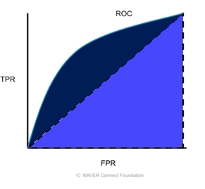 5. AUC(Area Under Curve): ROC곡선의 면적 in [0, 1]: 1은 잘 예측한 것, 0은 잘 예측 못한 것