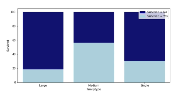 그러면 가족 규모에 따라서 생존률이 차이가 날까? (싱글, 5인 이상을 Large, 그 사이는 Medium이라 한다면?)