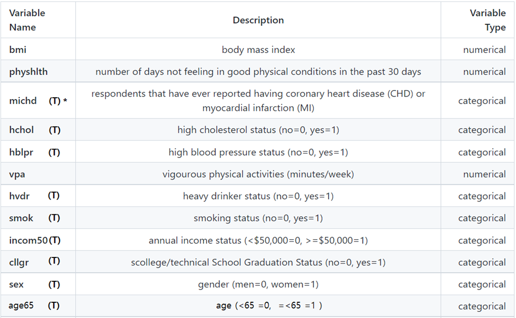 Thirteen survey questions are selected in this paper among core components and optional modules. This paper categorizes physical/mental health conditions, behavioral factors (physical activity, alcohol, smoking), and demography (sex, income, education, age group). The variables are listed below: