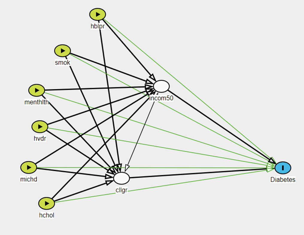 ‘incom50’ and ‘cllgr’ become the backdoor pathway because they are demographic factors that can combine with others. In this Figure, ‘incom50’ and ‘cllgr’ is the case when the value is zero since they are considered the prevention factors of diabetes. This Figure assumes ‘cllgr’ and ‘incom50’ can be combined. All treatment variables can directly form a causal relationship with diabetes.