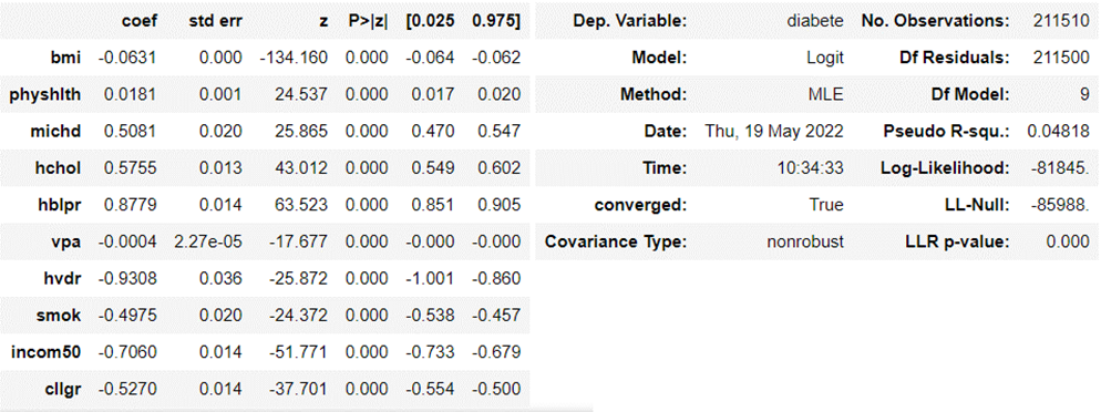 Logistic regression is needed to find the propensity score. Logistic regression applies to this data because diabetes is the binary response variable with multiple independent variables. For fundamental assumptions that logistic regression requires, the correlation coefficients between selected independent variables are less than 0.5. The VIF[3] for all the independent variables is smaller than 2. Hence, there is no strong multicollinearity in independent variables. The regression removed influential outliers through data cleaning, not to mention that the sample size is large enough. This indicates logistics regression is the appropriate method to analyze the data. The regression result of the multiple logistics regression model is below: