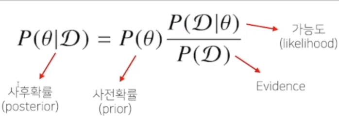 사후확률(posterior): 데이터 관찰 후에 이 파라미터(혹은 가정)이 성립할 확률