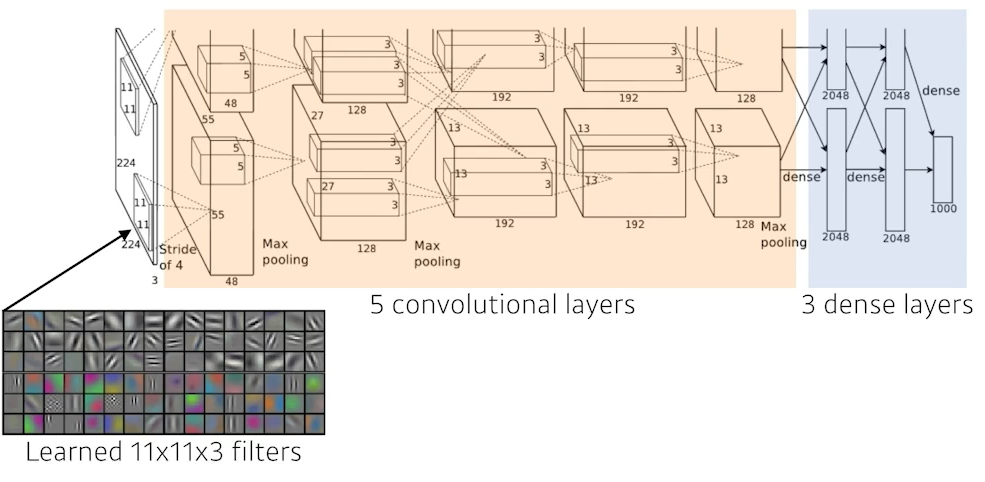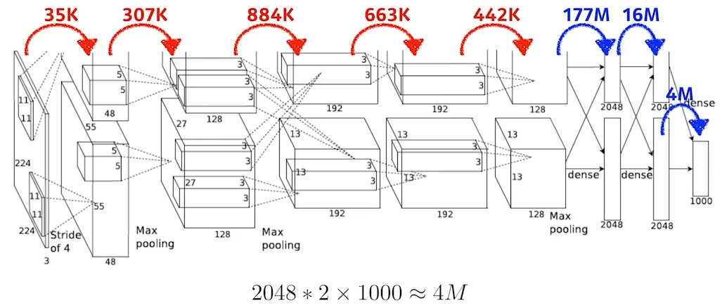 35k = 11 * 11(kernel 크기) * 3 (input depth, or channel) * 48 (output depth) * 2 (이러한 구조를 2개 만들기 때문)