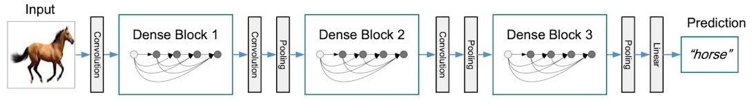 -> Dense Block(늘리기; concatenate) 와 Transition block(늘린 것을 1x1 conv로 다시 줄이기)를 같이 사용한다.