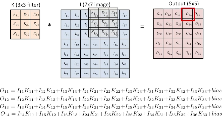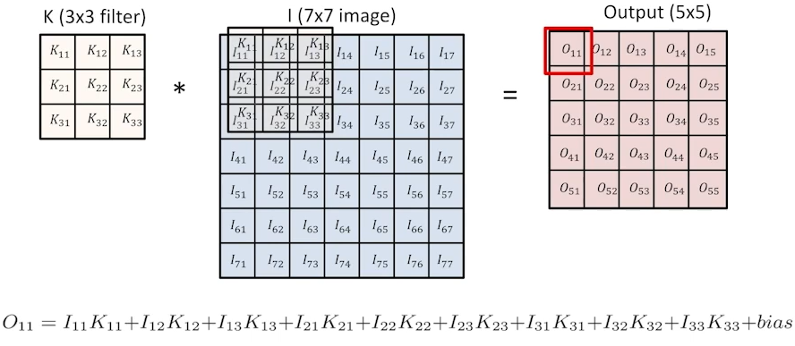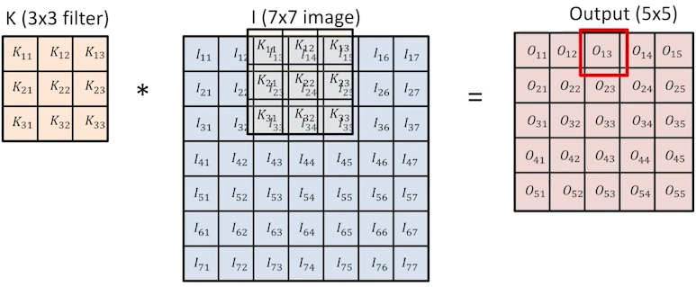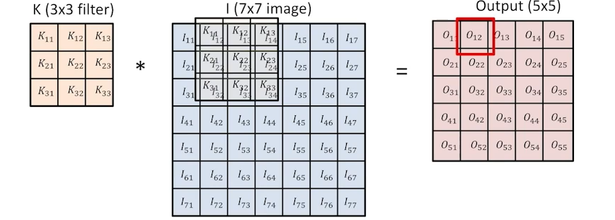 가장 기본적인 convolution 예제: 3x3 filter를 7x7 image에 convolution하면 5x5 output이 나온다.