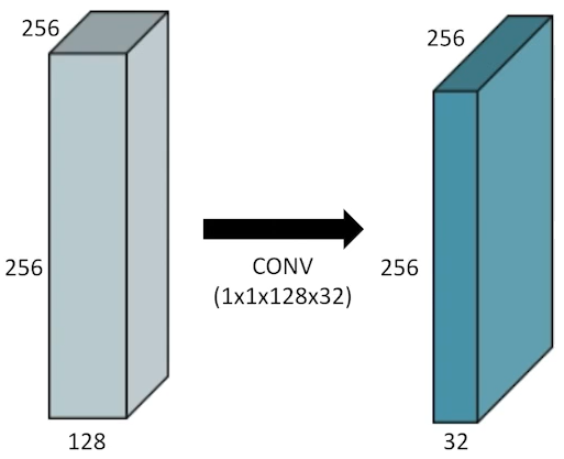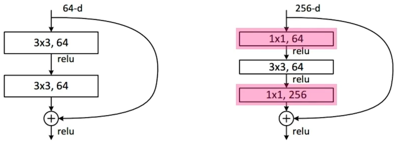 새로운 것(오른쪽): 3x3 filer 사용 전에 1x1 conv로 채널방향 dimention reduction 수행 후 3x3 적용