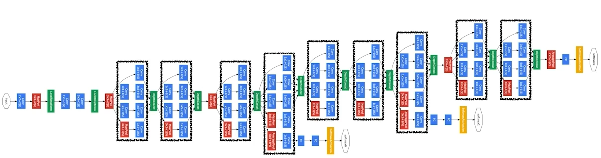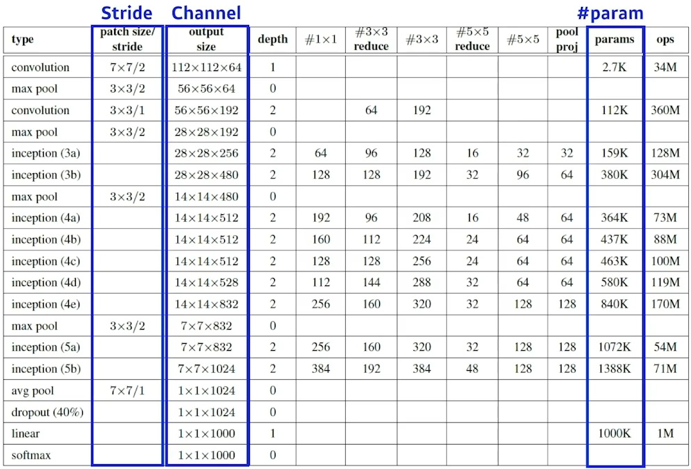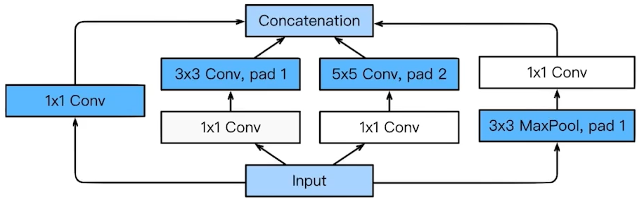 Inception blocks: input을 여러개로 나눠졌다가 다시 합치는 것. 이 과정에 1x1 Conv(파라미터 개수 줄어듦)가 point!