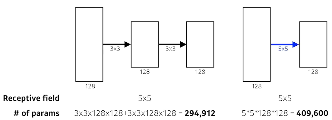 파라미터 개수가 작은거 2개쓰는게 큰거 1개쓰는것 보다 적어짐
