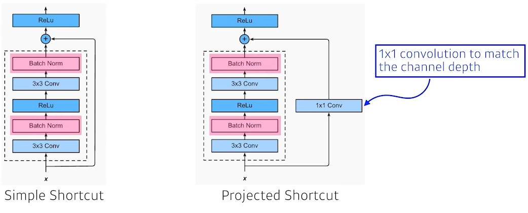 Projectecd Shortcut: 차원이 안맞을 때 1x1 Conv로 맞춰주는 경우