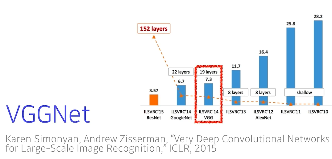 그외 기법: 1x1 convolution for fully connected layers(이걸로 파라미터 줄이려한 건 아님), Dropout(p=0.5), VGG16(레이어 16개), VGG19(레이어 19개)