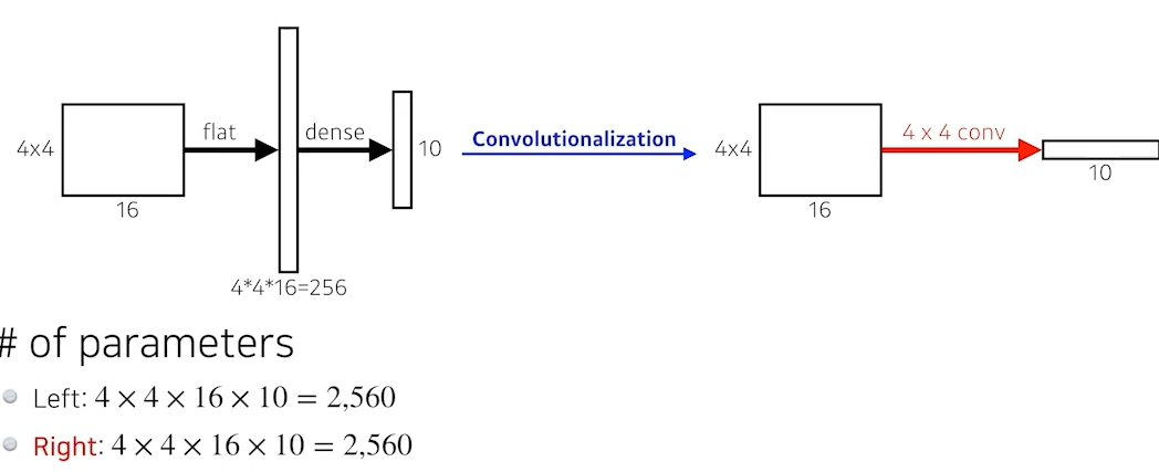 Convolutionalization: Dense layer를 없애는 과정 (큰 장점이 dense layer를 없애는 것)