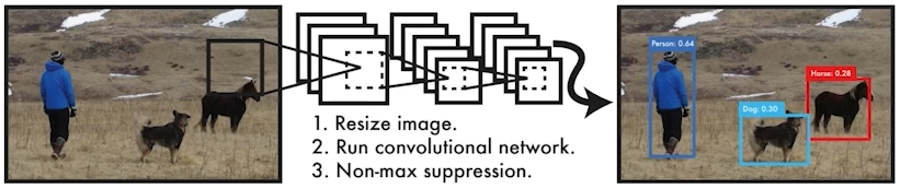 YOLO(v1): 매우 빠른 object detection algorithm. multiple bounding boxes와 class prbabilities 를 동시 추정!