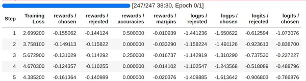 Calling the .train() on the orpo_trainer will start the training process. We can see in the pic that we get the training metrics like the training loss, rewards/chosen, rewards/rejected, and so on. There are a total of 247 steps that were taken to complete one epoch of training on the entire dataset. In the second pic, we can see that as the number of steps increased, the training loss has come down.
