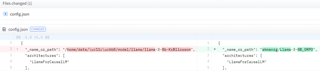 - 과정: 저장과정에서 생긴 config.json, adapter_config.json 두 파일의 base model path를