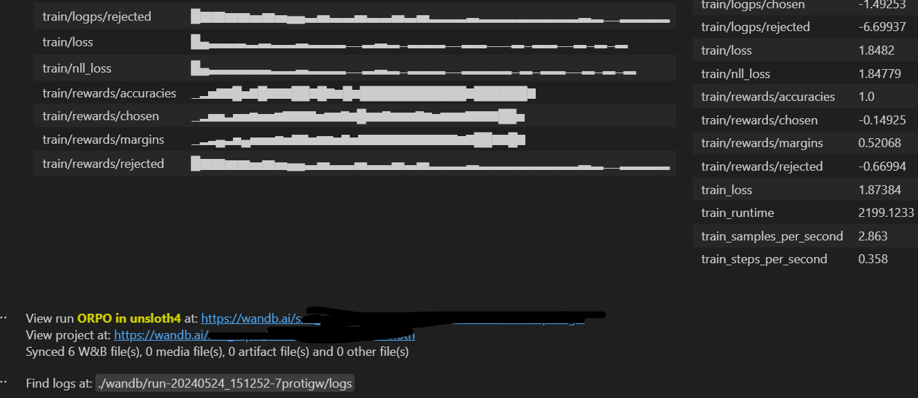 - 최적화된 훈련환경을 제공하여 훈련 결과에 나온 loss값이 같은 ORPO 설정값 기준 약 9.1 -> 3.9로 감소