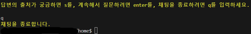 print("\n\033[93m답변의 출처가 궁금하면 s를, 계속해서 질문하려면 enter를, 채팅을 종료하려면 q를 입력하세요.\033[0m\n")