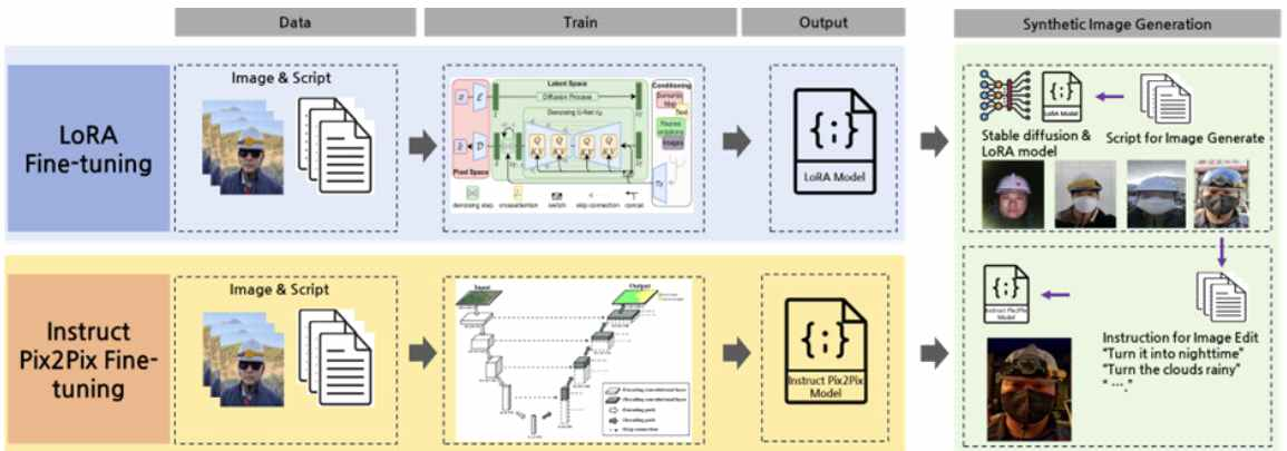 LoRA를 통해 만들어진 가상의 인물이 담긴 합성이미지들을 입력하여 개인식별 위험을 낮춤