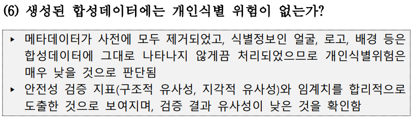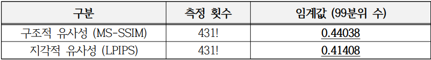 안전성 측정 방법: 각각 합성데이터에 대해 모든 원본 이미지로 1:1 유사성 비교 점수 측정, 합성데이터 1개와 원본 전체를 비교 후 평균내는 전수조사 -> 각 데이터 측정값이 모두 임계값 이하 -> 안전한 데이터로 판단.