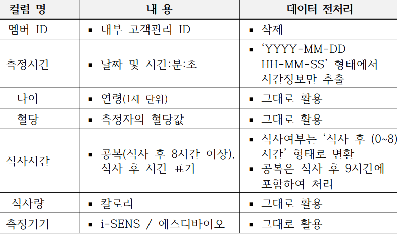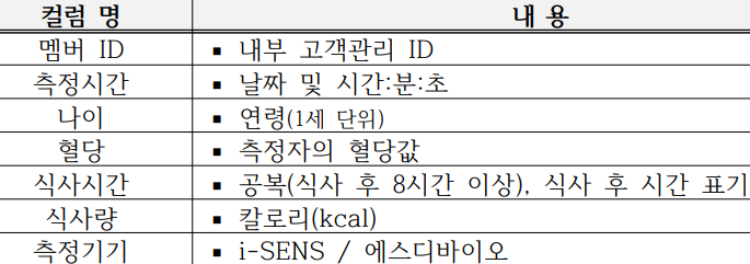 ▸ 속성 : 회원ID, 측정시간, 나이, 혈당, 식사 시간, 식사량, 측정 기기종류 등 (700건)