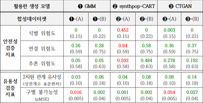 각각의 모델은 원본과 같은 수로 생성된 셋 A와 2배수로 생성 후 식별 위험도 높은 것을 삭제하여 원본과 같은 수로 줄여 생성한 셋 B 둘 다 적용 -> 각 모델별 A,B 셋이 나오므로 총 6개의 합성데이터 셋 생성