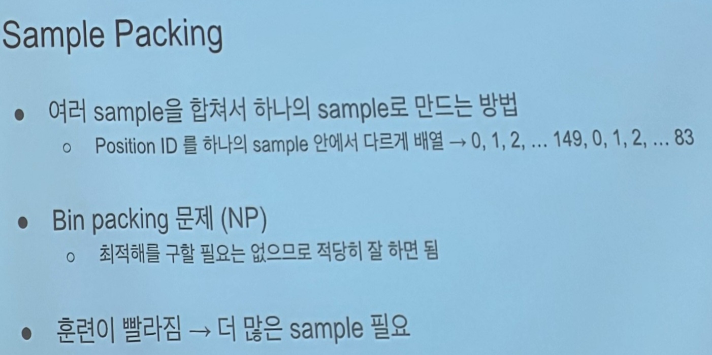 그리고 이것저것 튜닝해본 결과, 하이퍼 파라미터 조정 등을 포함한 packing으로 인한 loss가 있더라도 그게 성능측면에서 크게 눈에 띄지 않는다고 함. 결국 중요한건 데이터의 질과 양