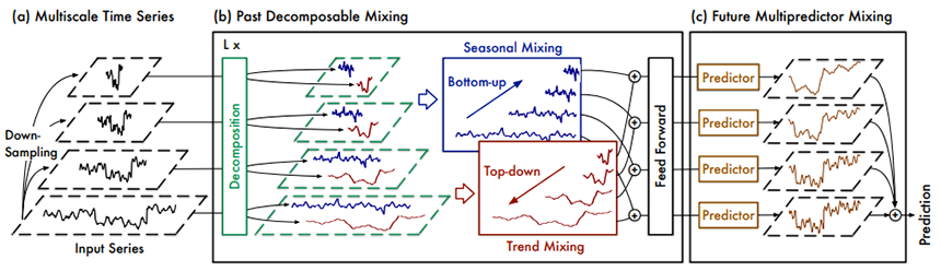 Seasonality 구성 요소에 상향식 (Fine-to-coarse) Feature Mixing 전략 사용 -> 기존 방법 능가하는 시계열 예측 성능