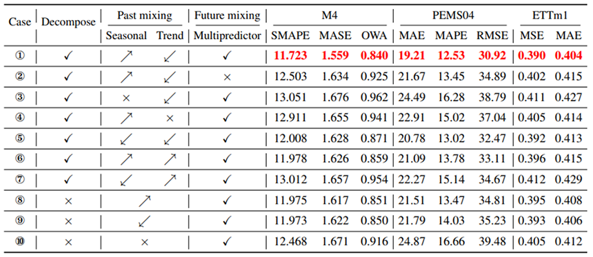 -> Feature Mixing 진행: 각 구성 요소 특성 반영하여 다중 스케일 시계열의 정보를 혼합