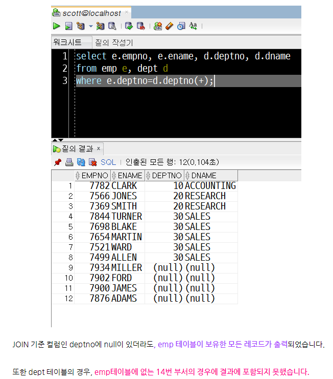 WEHRE E.DEPTNO = D.DEPTNO(+)