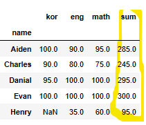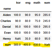 df_copy.loc['sum'] = df.apply(get_sum, axis=0) # 과목 별 점수 합계