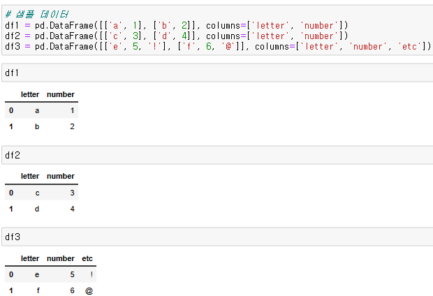 주어진 데이터가 다음과 같을 때 row연결 concat()을 다음과 같이 사용.