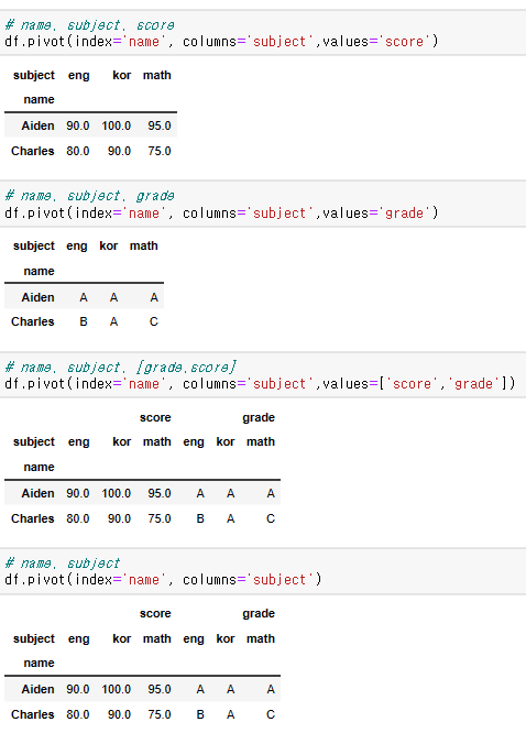 -> df.pivot( index=row 인덱스col, columns=col 인덱스, values=값으로 사용할 자료 )