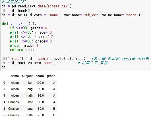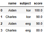 df.melt(id_vars='name', value_vars=['kor','eng'], var_name='subject', value_name='score')