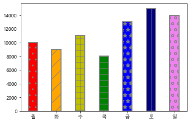 plt.bar(df1['요일'],df1['매출액'], hatch='/')