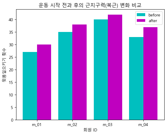 plt.title('운동 시작 전과 후의 근지구력(복근) 변화 비교')