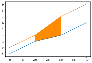plt.fill_between(x[1:3], y1[1:3], y2[1:3], color='darkorange')