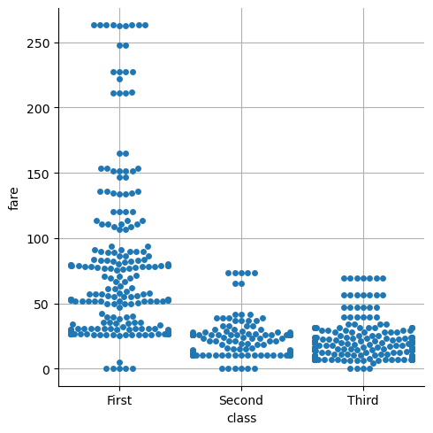 sns.catplot(x='class', y='fare', kind='swarm', data=titanic3)