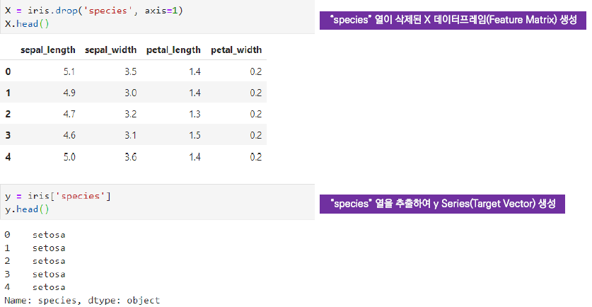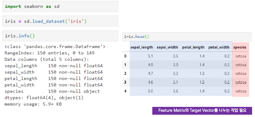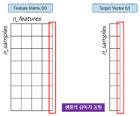 Target vector: 특징행렬(x)로부터 예측하고자하는 값의 벡터 (= 종속변수, 출력변수, 결과변수, 반응변수)