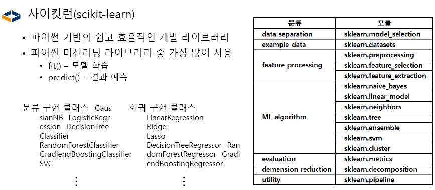 알고리즘 -> python class. Data set -> numpy 배열, Pd (df), Scipy 등